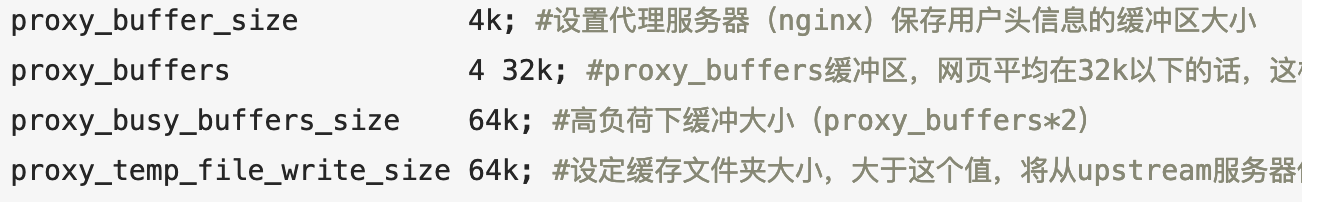 proxy_buffer_size 4k; #设置代理服务器(nginx)保存用户头信息的缓冲区大小