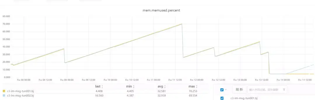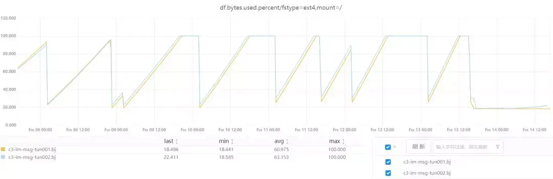 春节值班期间收到反馈,c3-im-msg-tun001.bj 和 c3-im-msg-tun002.bj 这两台服务器资源使用异常,主要是mem和disk,监控图如下,图中资源占用突降是手动清理进程和文件的结果,这种手段治标不治本。