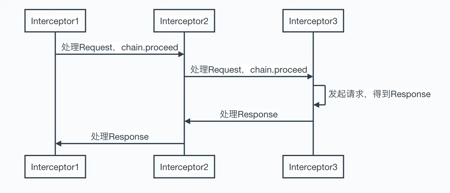 像这样的Interceptor 我们可以添加很多个,参数是Interceptor.Chain一个链。所以应该可以想像这是一个链式处理,一层层深入,详细可看RealInterceptorChain。