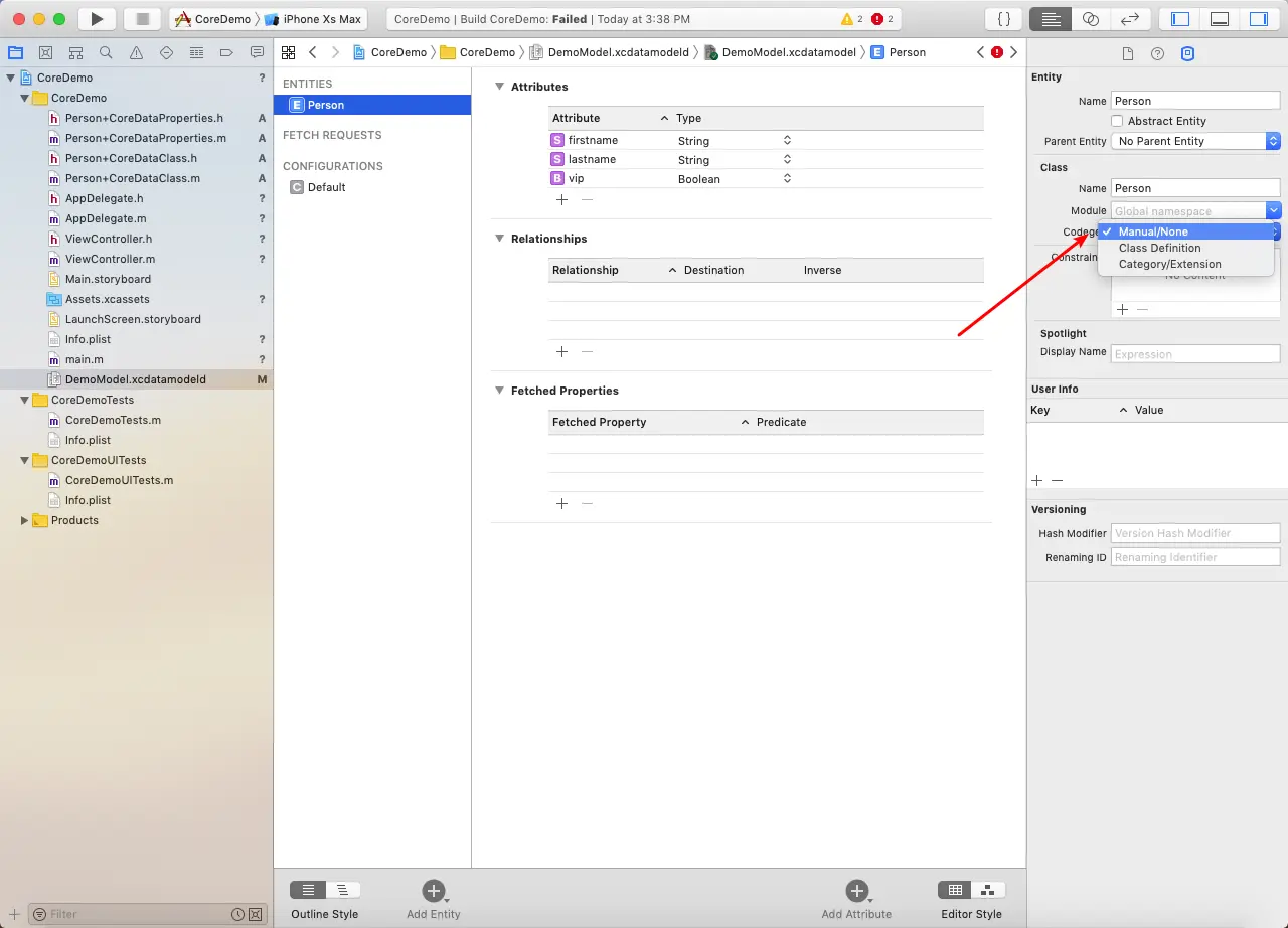 NSManagedObject类是,编译报上述错误。因为.xcdatamodeld文件在编译时会自动生成实体类,需要禁用这个功能。