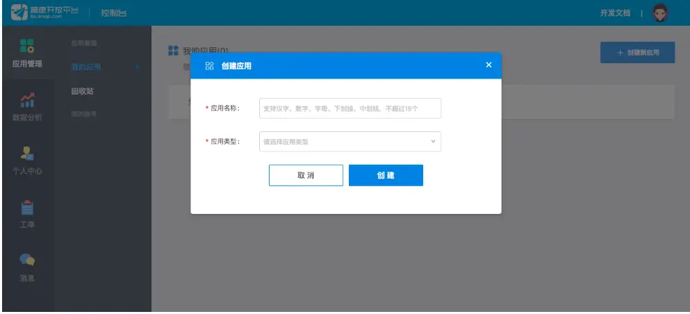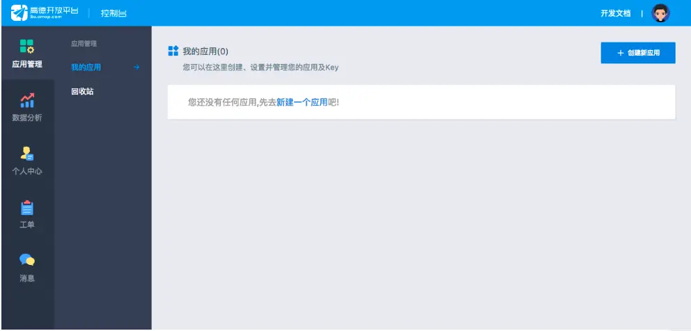 进入控制台,创建一个新应用。如果之前已经创建过应用,我的应用列表中就会有显示名称以及创建时间