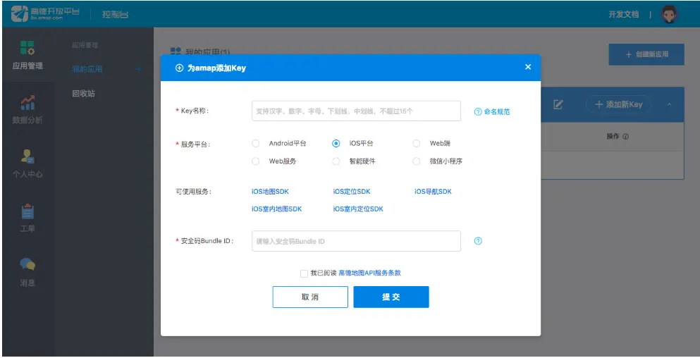 在创建的应用上点击添加新Key,在弹出的对话框中填写相应的资料。