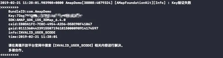 需要注意的是: 1个KEY只能用于一个应用(多渠道安装包属于多个应用),1个Key在多个应用上使用会出现服务调用失败。当Key与所关联的bundle ID 不一致时,控制台会打印如下内容