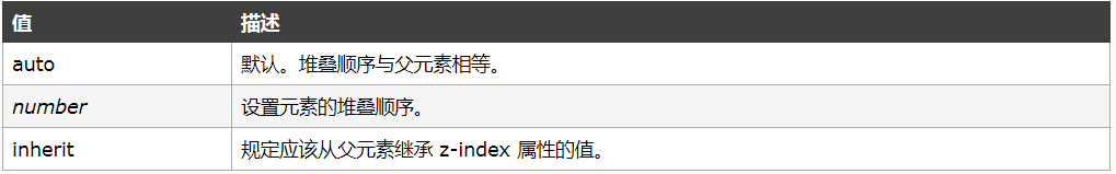 说明:该属性设置一个定位元素沿 z 轴的位置,z 轴定义为垂直延伸到显示区的轴。如果为正数,则离用户更近,为负数则表示离用户更远。