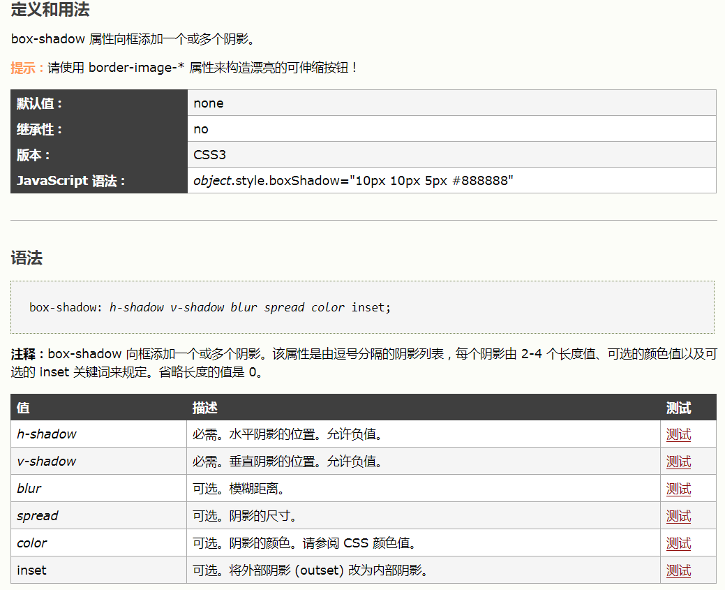语法:box-shadow: h-shadow v-shadow blur spread color inset;