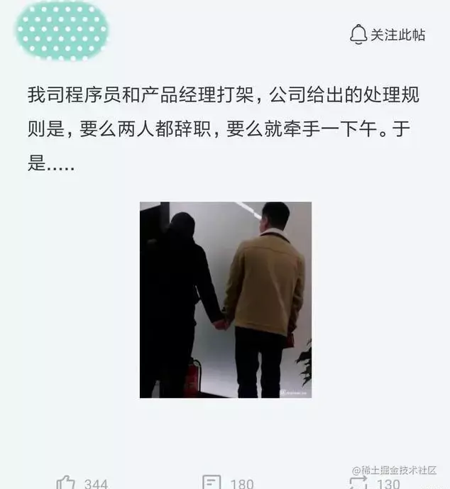 今日在职场论坛里,有位网友发帖晒出了,他们公司程序员和产品经理相爱相杀的照片,让无数的吃瓜网友们也都大吃一惊。不久前他们公司里的一位程序员,在和产品经理沟通的时候起了争执,互不相让的两个人随后居然大打出手,打起架来,场面一度很激烈。