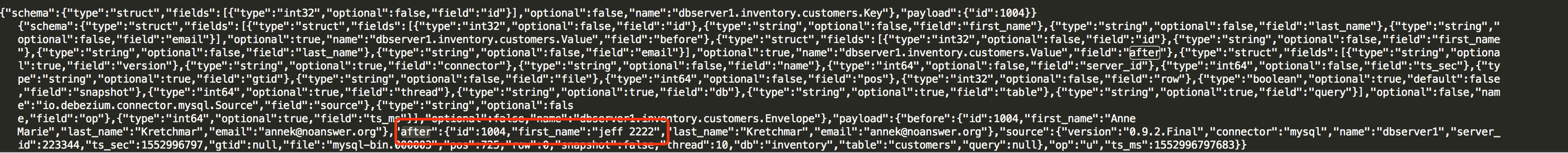 docker run -it --name watcher --rm --link zookeeper:zookeeper --link kafka:kafka debezium/kafka:0.9 watch-topic -a -k dbserver1.inventory.customers