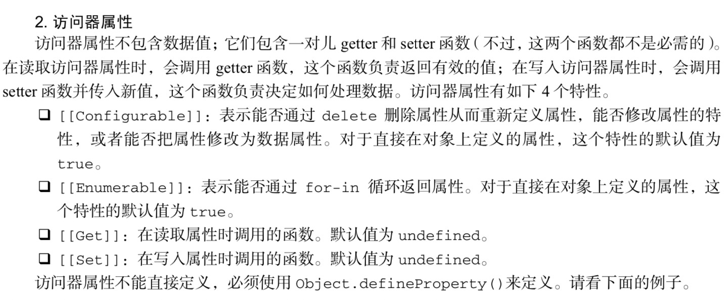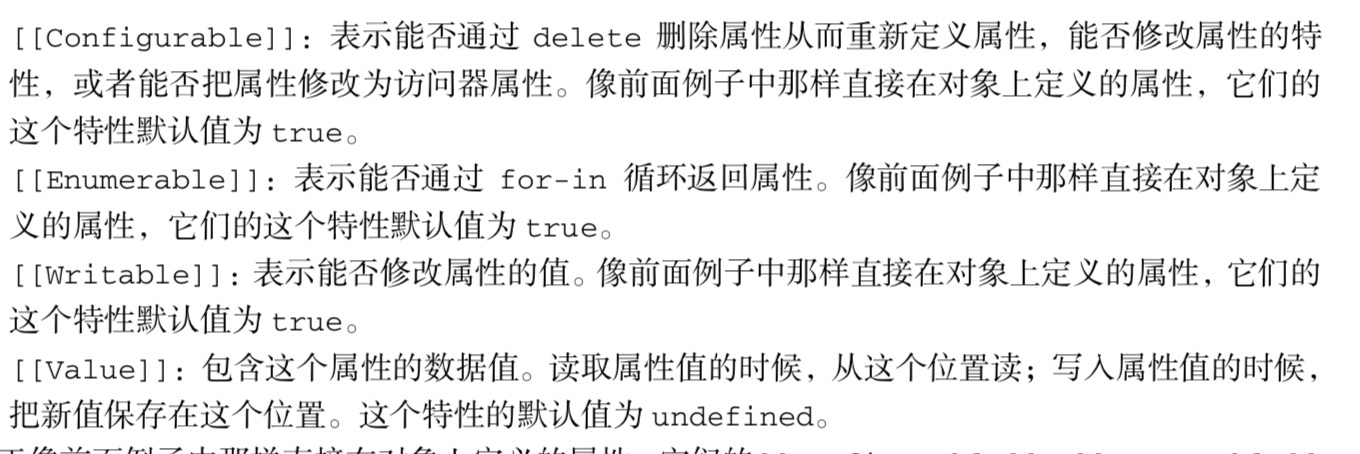 在调用 Object.defineProperty()方法时,如果不指定,configurable、enumerable 和 writable 特性的默认值都是 false。多数情况下,可能都没有必要利用 Object.defineProperty() 方法提供的这些高级功能