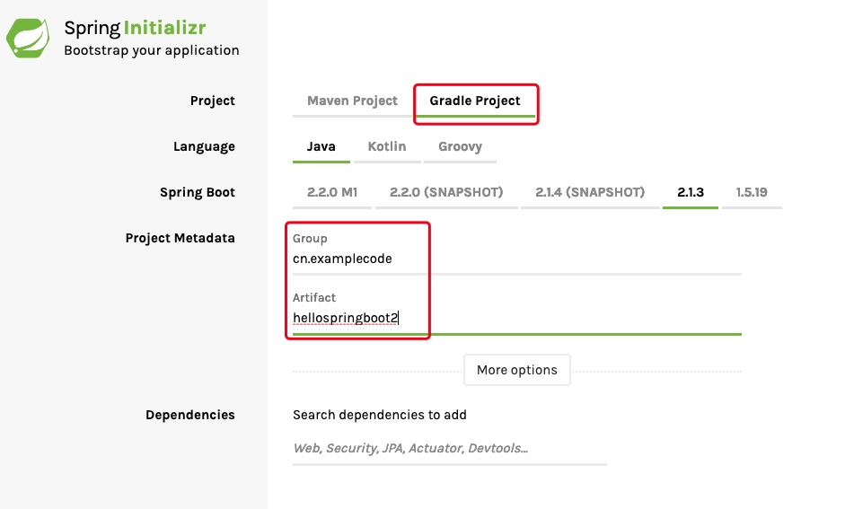 然后填入工程信息 注意这里有使用Maven还是Gradle的选择。我们这里既然要零XML配置,这里选择使用Gradle工程,如图。我们使用Sprint Boot的目的也就是简化我们的开发生活,不是吗?