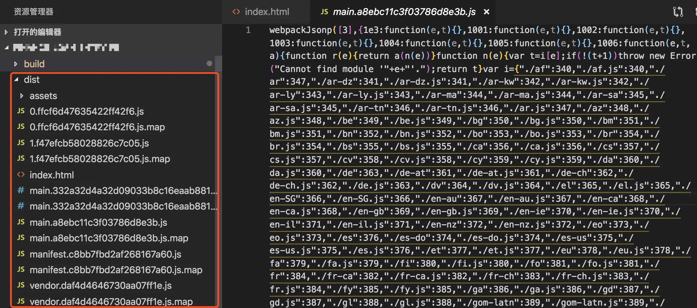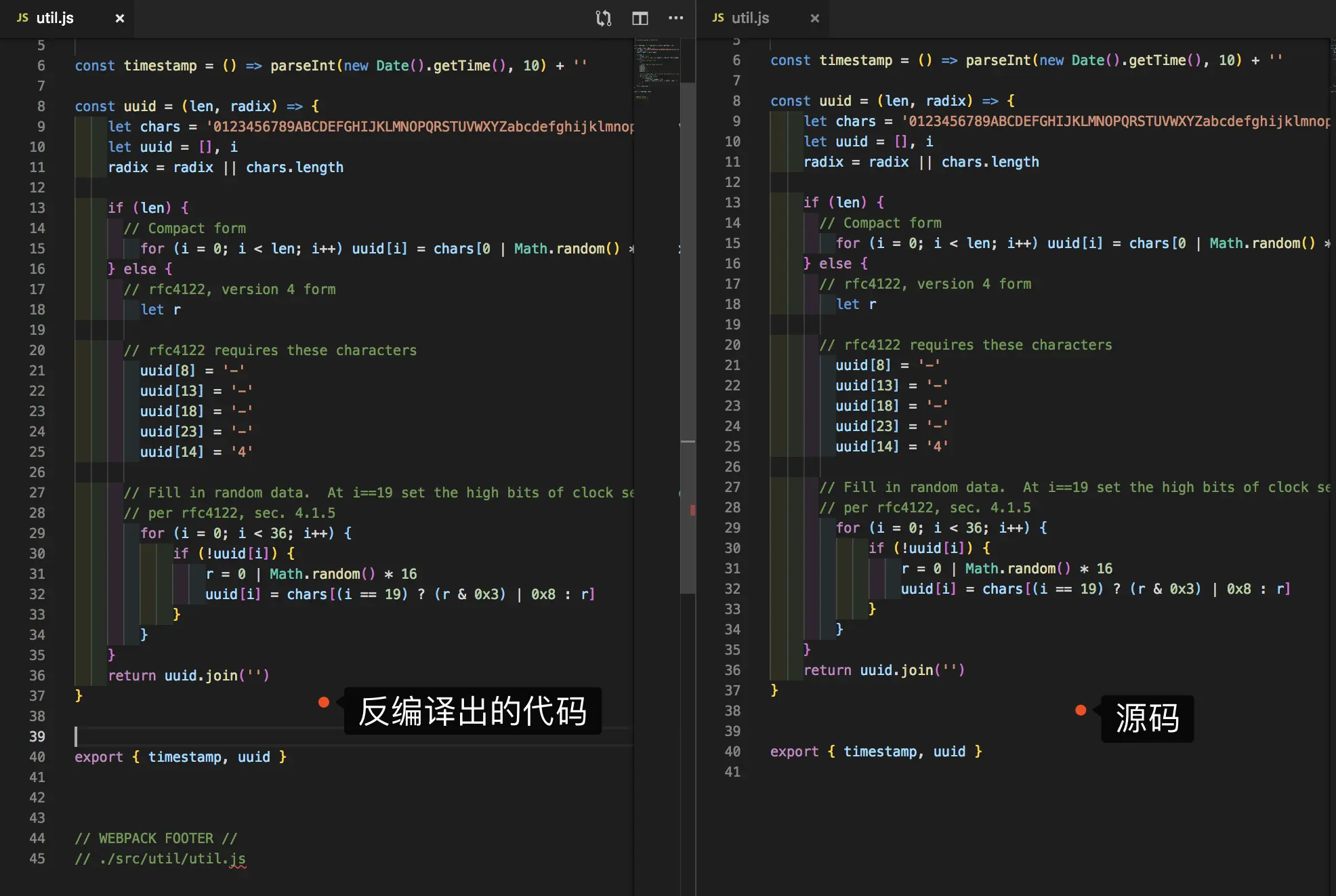 虽然map文件提供了便利,但是在生产环境,为了安全,是建议关闭SourceMap的,因为通过.map文件和编译后代码可以很容易反编译出项目的源码,这样就相当于泄露了项目的代码。下面做个测试: