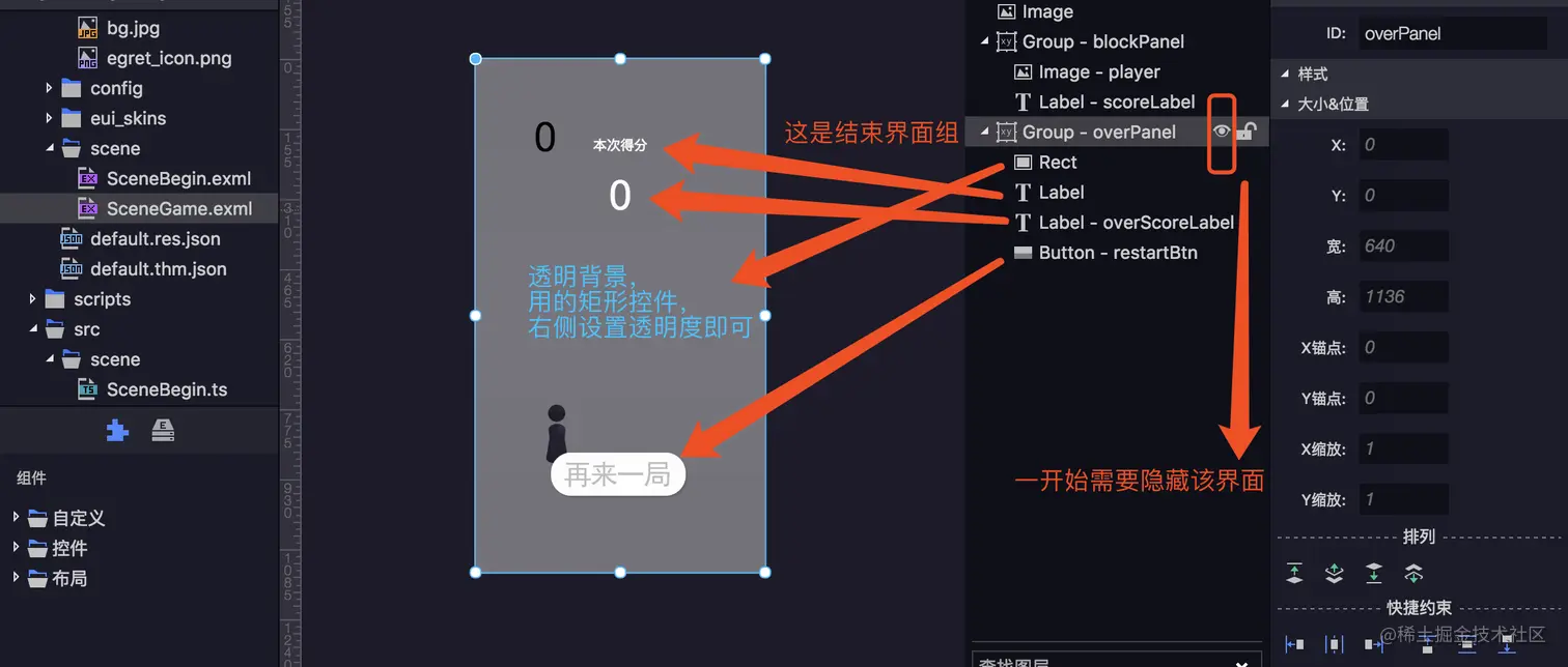 写游戏场景。什么是场景呢,其实就是 UI 界面。一般我们可以把游戏分成(至少)3 个场景,分别是开始场景、游戏场景和结束场景(如下图所示)。然后利用 egret 的 EUI 功能(可视化布局),我们可以很容易的创建静态场景(要有场景的意识),不用写一句代码(开心😄),界面就有了,真的是好容易,谁用谁知道!🎉🎉🎉