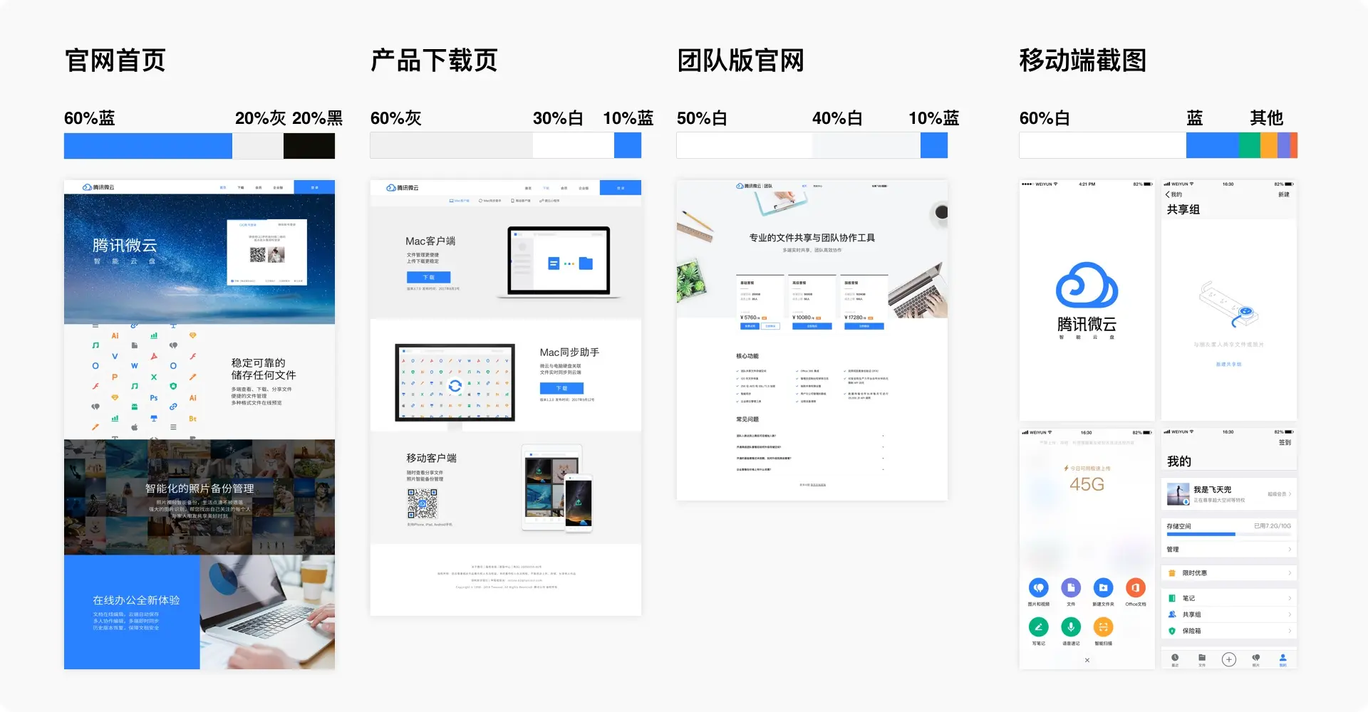 微云的平台较多,包括WEB端、PC端、移动端、小程序等,其中WEB端和移动端的用户最多,就从这两个端入手,分析产品界面的品牌特征。从结构布局和从色彩比例上,可以归纳两端的共同点:结构清晰、留白较多、简约干净。