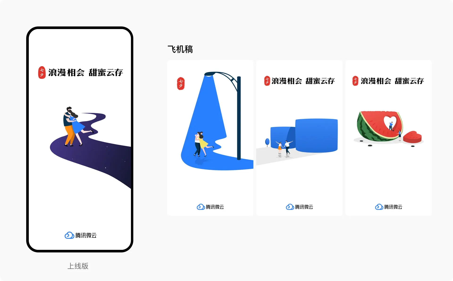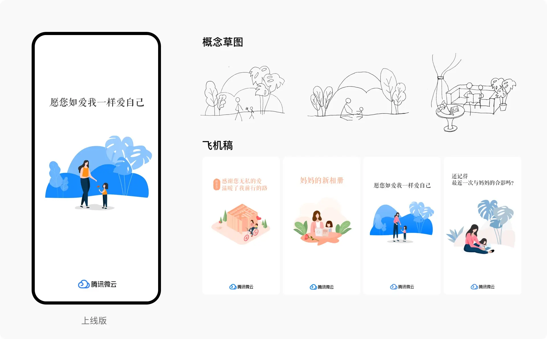 劳动节闪屏上线后,我们进行了复盘,我们希望微云的节日闪屏给用户传达的是“你的珍贵回忆微云帮你记录”这样的小心思,而不是“我们有xx功能”之类的广告,所以在以后的节日闪屏中,我们会更加倾向节日故事性的表达;视觉风格则采用简约、干净、留白的方式,重点突出人物故事,不在场景上过多渲染。