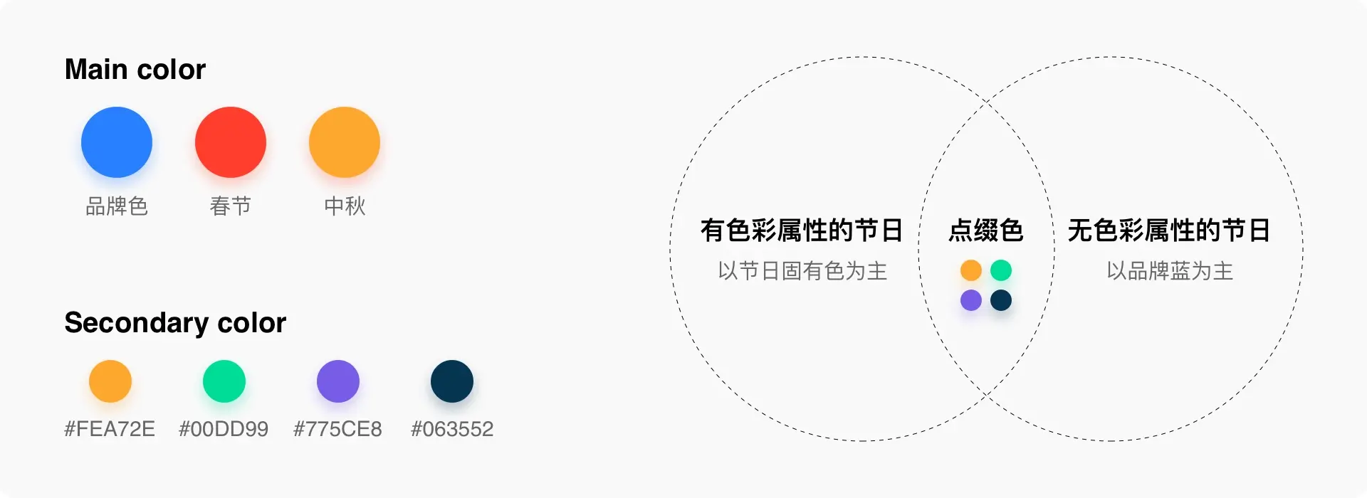 色彩作为用户最容易感知的部分,使用时与品牌相呼应,主色与辅助色均来源于产品图标。有明显色彩属性的节日,以节日固有色为主,比如春节红色,中秋黄色等等;无明显色彩属性的节日,可以以品牌蓝为主,强化品牌印记。