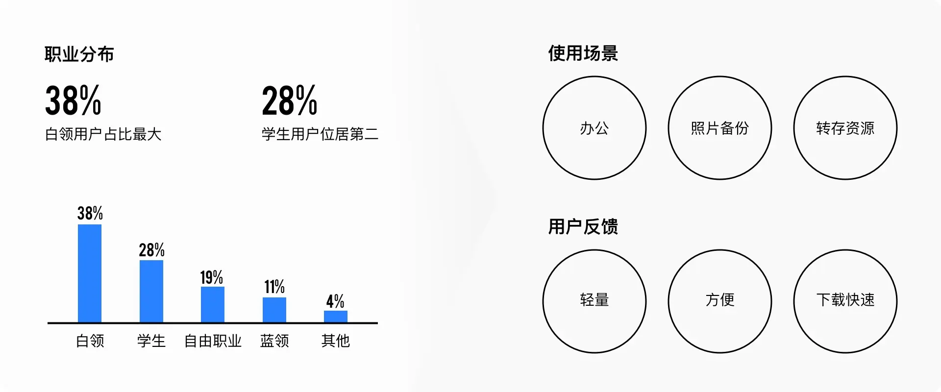 微云用户在职业分布上,白领用户占最大;结合使用场景分析,用户反馈最多的词是:轻量、方便、下载快速。
