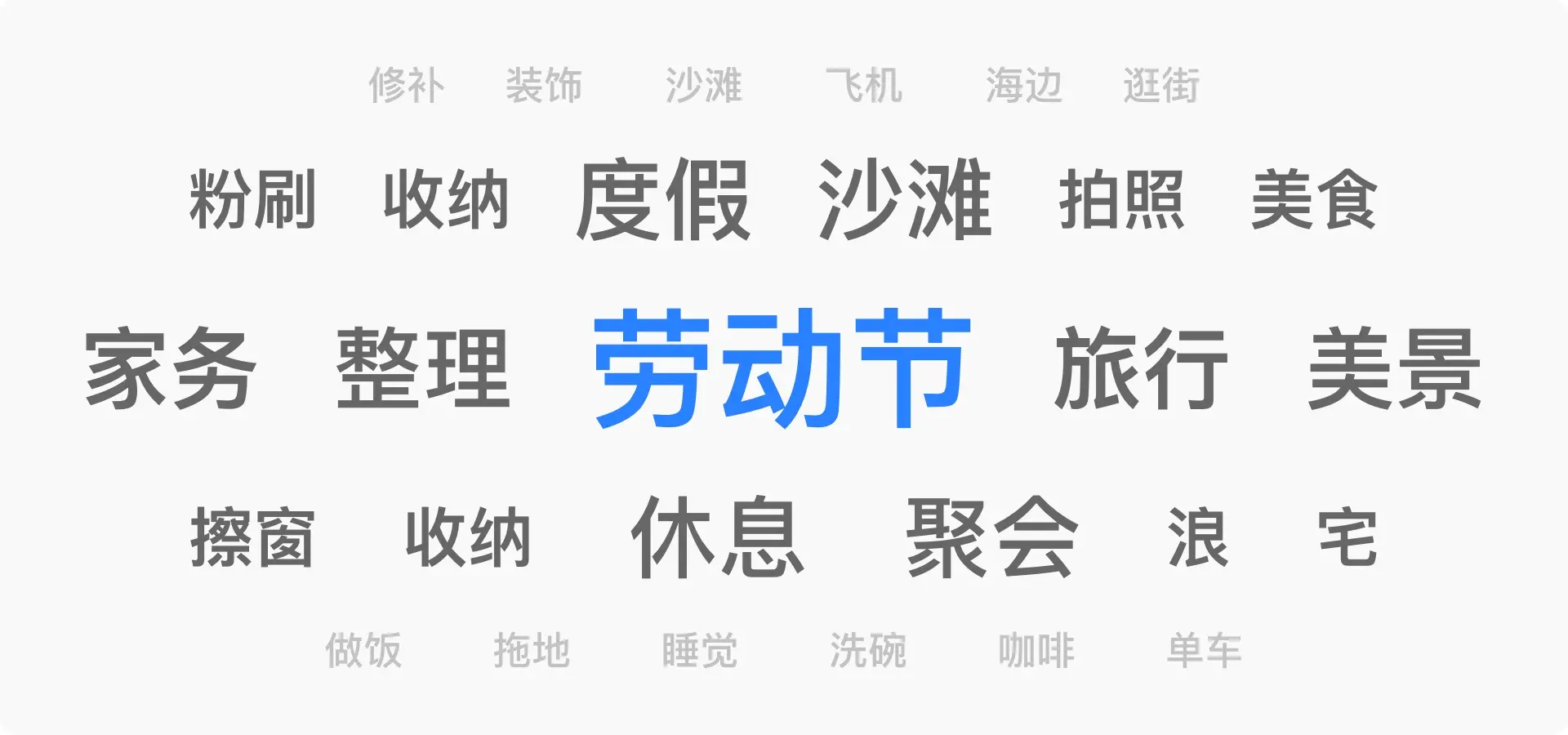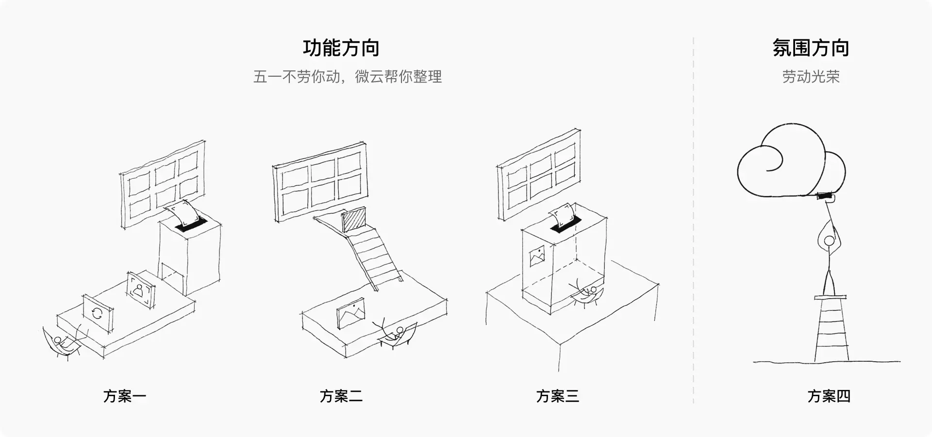 微云是一个工具化的产品,旅行/度假更适合旅行类产品,劳动/休息与微云更契合。结合产品功能,定了两个方向,第一个是“五一不劳你动,微云帮你整理”,与备份照片功能结合;第二个是“劳动光荣”,凸显节日气氛。以下是一些草图方案: