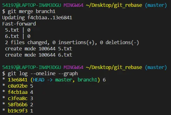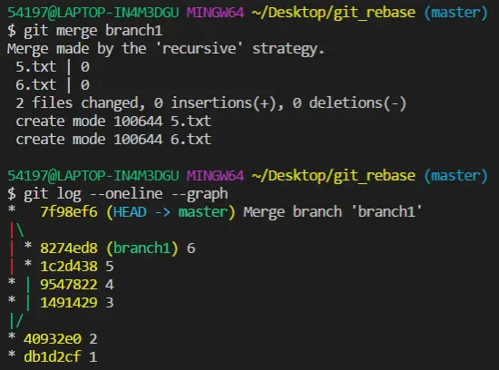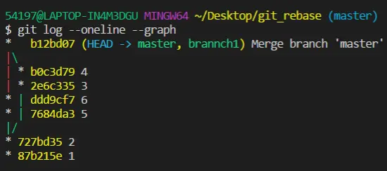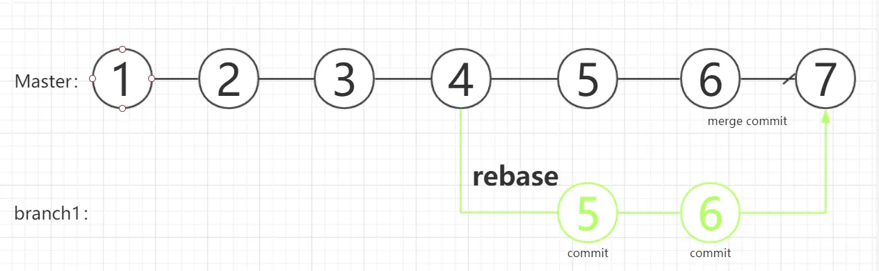 此时我们的 git log 上保留了分支branch1的 5 和 6 的commit提交,且又在主分支Master上自动创建了一个新的commit提交节点 “7”。