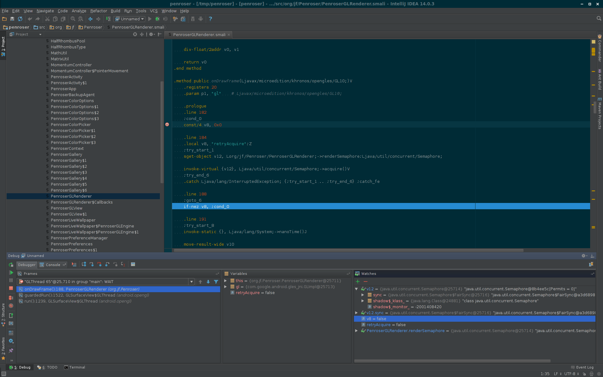 注意:单指令单步调试在 IDEA 14.1及以上版本支持(Android Studio是基于IDEA的,所以类似)。而此之前的版本,执行单步调试的时候,回调转到下一个.line指令,而不是下一条指令。