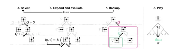 Select,如果当前节点不是叶子节点则通过特定的UCT算法(探索-利用算法,通过神经网络预测的胜率值(q值)以及先验概率计算选择概率,胜率/先验概率越高选择几率越大)找出最优的下一个落子位置,搜索进入下一层,直到当前节点是叶子节点。