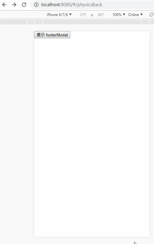 假设需要进行模拟拦截返回操作的主页面路由为 /physicsBack,其下有个子路由 /physicsBack/footerModal,当路由为 /physicsBack时就只显示页面,当路由为 /physicsBack/footerModal时,就在 /physicsBack上弹起弹层