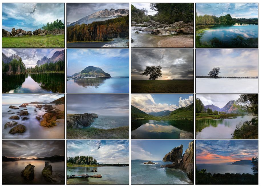英伟达新方法在 Flickr Landscapes 数据集上的语义图像合成结果,并不是真人拍摄的哦~
