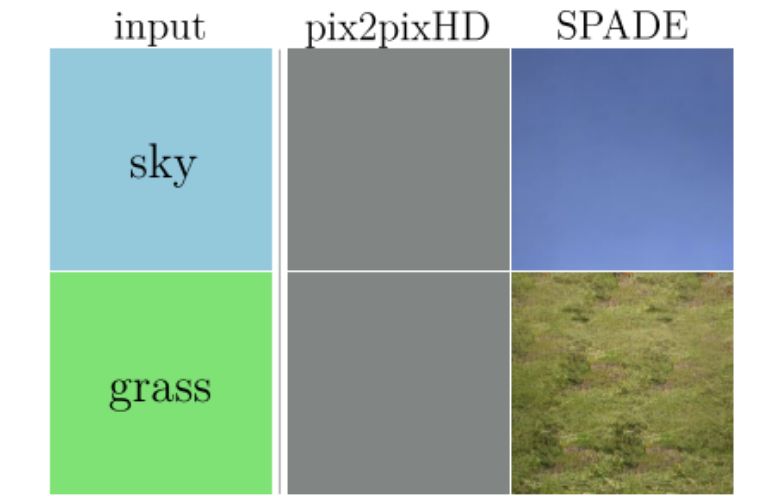 图 3:给定统一分割图的对比结果:SPADE 生成器生成了貌似真实的纹理,pix2pixHD 因归一化层后语义信息的丢失生成了完全相同的输出。