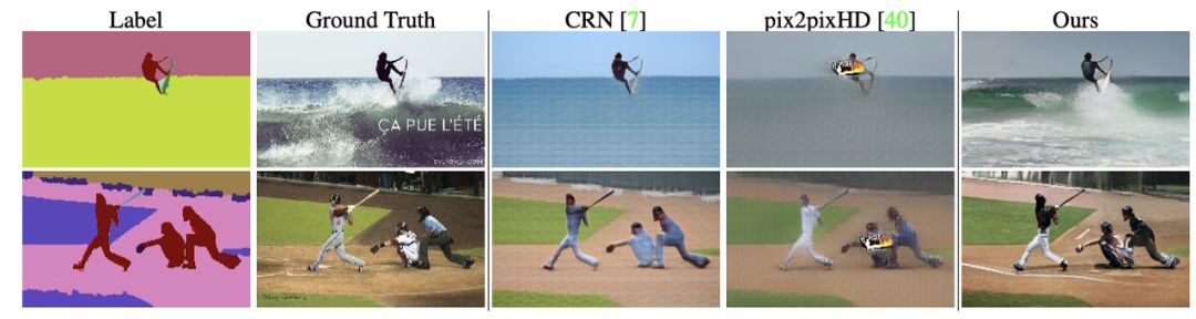 图 5:基于 COCO-Stuff 数据集的语义图像合成结果可视化比较。该方法成功地从语义标签中合成了真实的细节。