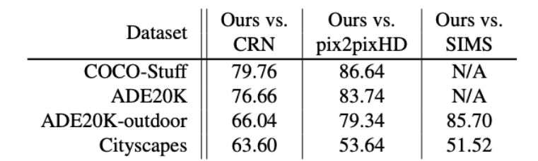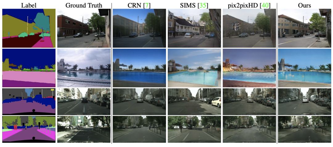 图 6:基于 ADE20K outdoor 和 Cityscapes 数据集的语义图像合成结果可视化比较。该方法在基于空间语义布局的同时生成逼真的图像。