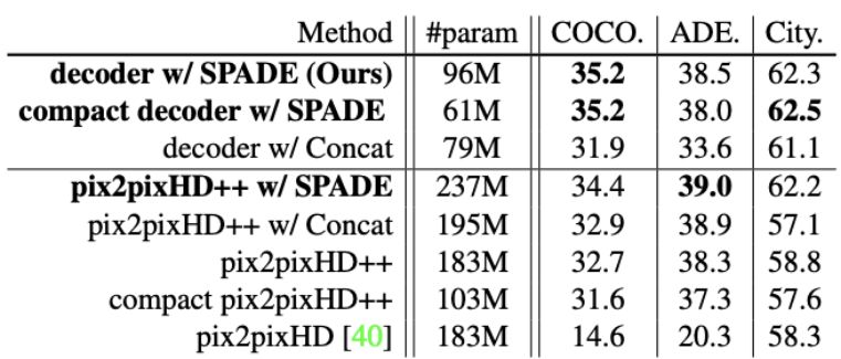 表 3:对于解码器架构(图 4)和 pix2pixHD++的编码器-解码器架构(在 pix2pixHD 基础上的改进基线)而言,当使用 SPADE 层时,mIoU 分数会提高。另一方面,在每一层简单地连接语义输入并不能做到这一点。此外,本研究中所有层上深度更小的简洁模型超越了所有基线。