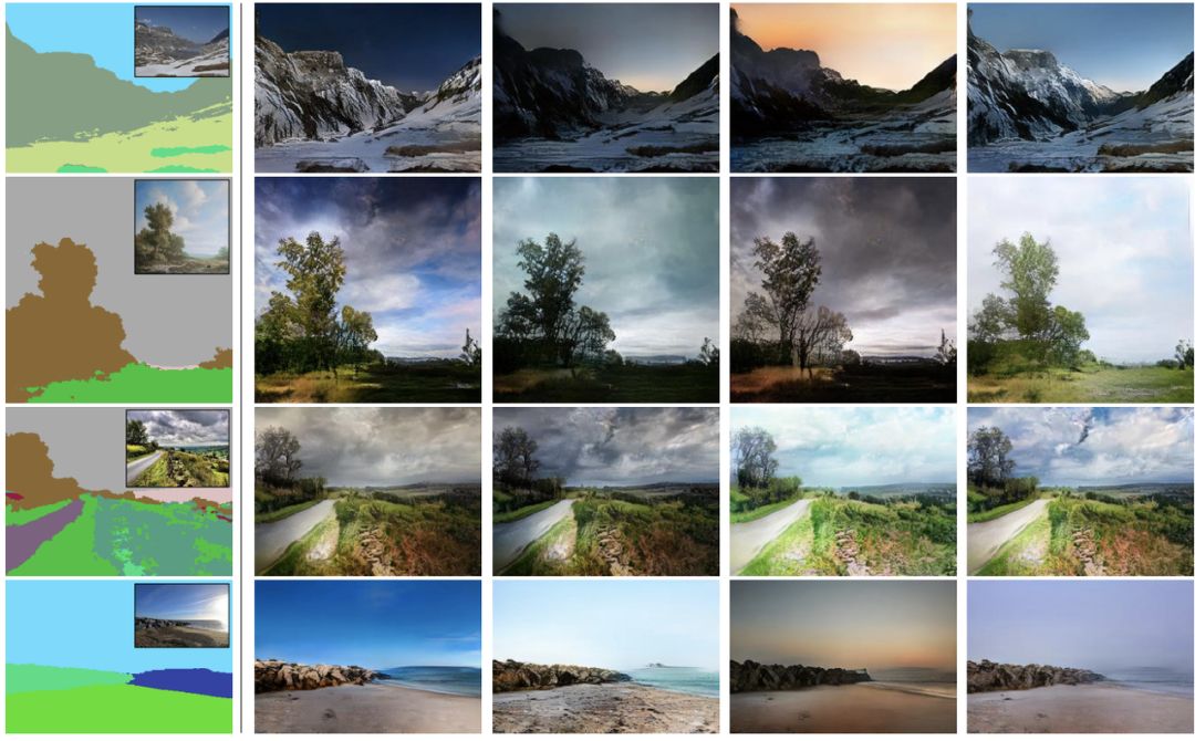「这就像一本彩色画册,描述了树在哪里,太阳在哪里,天空在哪里。」Catanzaro 表示,「然后神经网络就能根据它对真实图像的了解,填充所有的细节和纹理,以及反射、阴影和颜色……该技术不仅可以整合其他图像或切割、粘合图像纹理,实际上还可以合成新的图像,这与画家的绘画方式非常相似。」