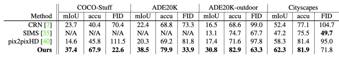 表 1:在所有的基准数据集上,该方法在语义分割得分(平均 IoU 和整体像素精度)和 FID 上都优于目前领先的方法。mIoU 和像素精度值越高越好。FID 值越低越好。