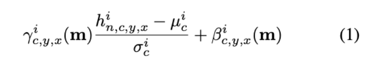 假设语义分割掩码 m ∈ L^(H×W),L 是一组表示语义标签的整数,H 和 W 分别是图像的高和宽,m 中的每个条目表示一个像素的语义标签。给定一个包含 N 个样本的 batch,h^i 表示深度卷积网络第 i 层的激活,C^i 表示该卷积层中的通道数,H^i 和 W^i 分别表示该层激活图的高和宽。与批归一化类似,SPADE 方法中的激活函数被逐通道归一化,然后用学习到的 scale 和偏置项进行调整。