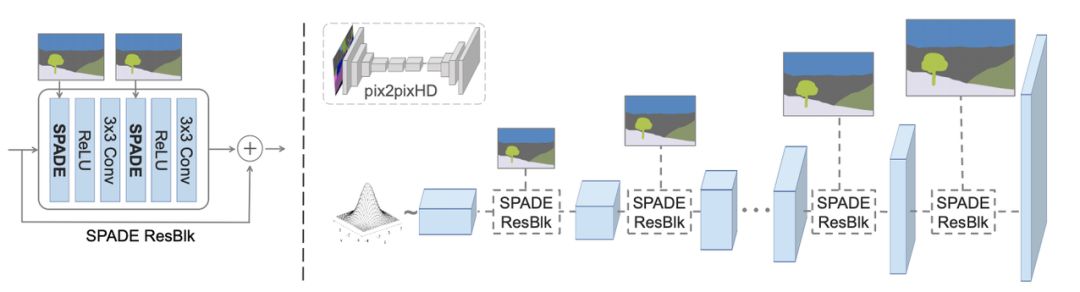 图 4:在 SPADE 生成器中,每个归一化层都使用语义掩码来调节层激活函数。(左图)具有 SPADE 的一个残差块结构。(右图)该生成器包含一系列带上采样的 SPADE 残差块。该架构通过去除领先的图像到图像转换网络(pix2pixHD)的下采样层,用更少的参数实现了更好的性能。