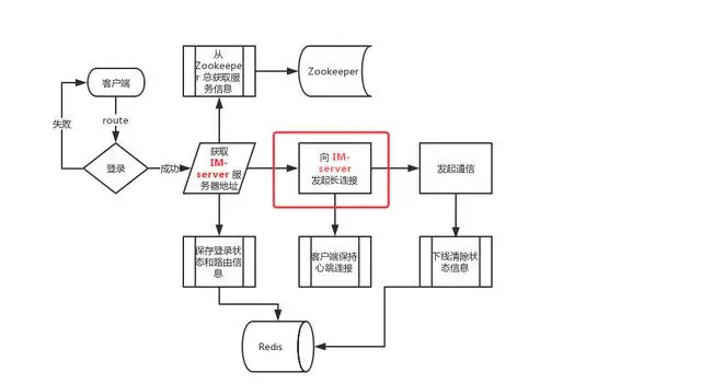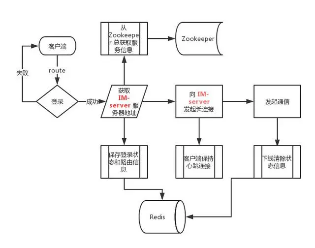 - 登录成功从 Zookeeper 中选择可用 IM-server 返回给客户端,并保存登录、路由信息到 Redis。