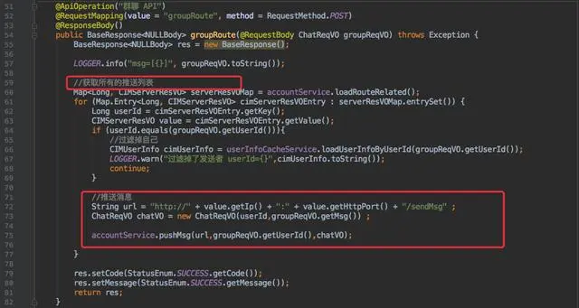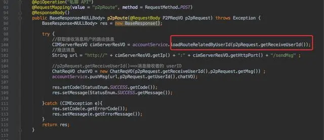 所以私聊接口在收到消息后需要查询到接收者所在的 cim-server 实例信息,后续的步骤就和群聊一致了。调用接收者所在实例的 HTTP 接口下发信息。