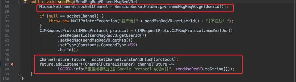 cim-server 收到消息后会在内部缓存中查询该 userID 的通道,接着只需要发消息即可。