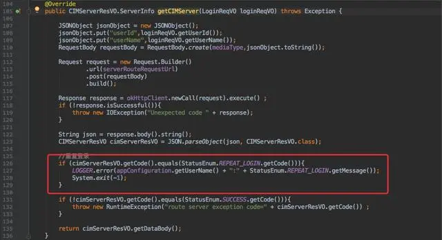 登录过程中 route 接口会判断是否为重复登录,重复登录则会直接退出程序。