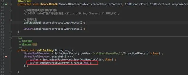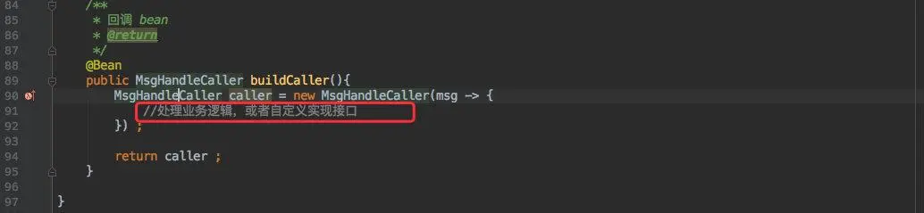 因此先创建了一个 caller 的 bean,这个 bean 中包含了一个 CustomMsgHandleListener 接口,需要自行处理只需要实现此接口即可。