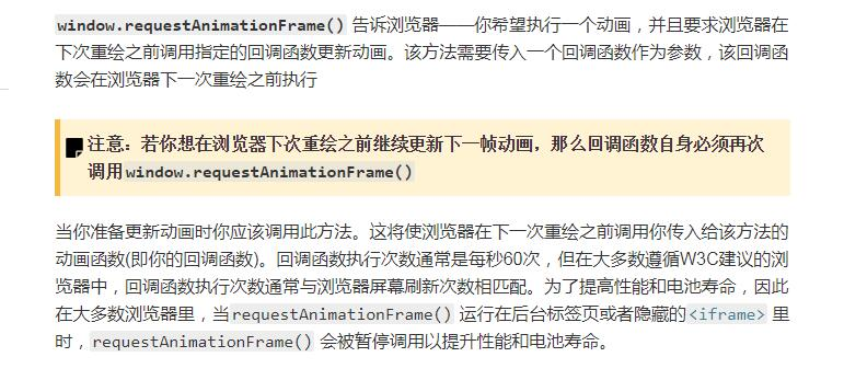 也就是说此方法会用浏览器的最佳渲染频次进行方法调用。适用于动画绘制(从名字上也能看的出来)。 触发时间间隔 1000ms/60,约等于16.6ms每次。
