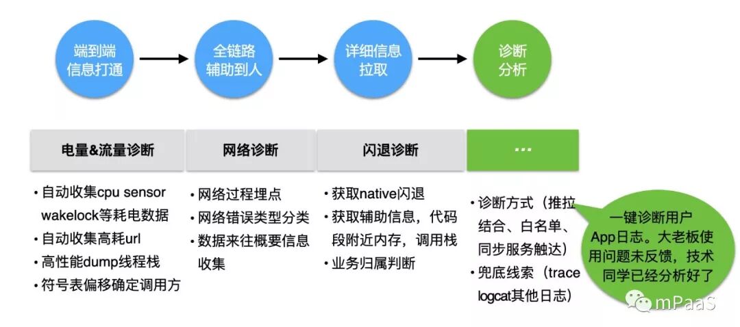 参考这张图,我们能够清晰地了解支付宝内部是如何进行问题诊断与定位:从“端到端的信息打通”到“全链路辅助到人”,“详细信息拉取”后在进行相应的“诊断分析”,同时会配备具体的诊断策略。