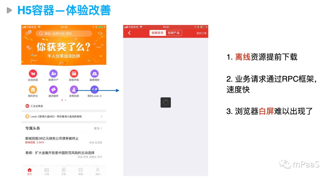 首先,我们来看H5加载,传统意义上的H5,在进入的时候上面会有进度条或者转菊花,体验会不太好,我们的容器是怎么解决这个问题的呢?