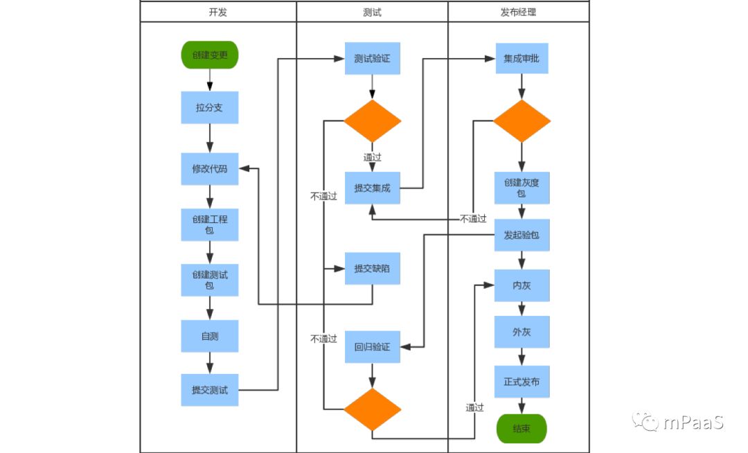 因此,基于前面介绍的各种开发框架,这里可以分享一下支付宝的研发流程,分为「开发、测试、集成发布」这些过程: