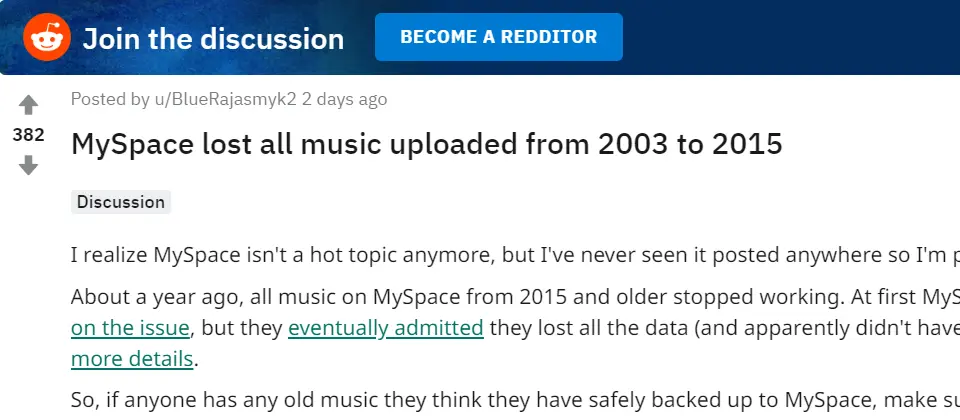 还记得MySpace吗?那个曾在2006年引领风骚、一度超越网络大厂成为美国最多人造访的社交网站,最近又再度成为新闻焦点,只不过,这次是因为有MySpace用户抱怨,MySpace搞丢了使用者在2003年到2015年间所上传的音乐。当初的MySpace提供许多个人化服务,包括部落格、社团、照片、音乐及影片,用户可将自己的内容上传到MySpace,以直接于网站上听音乐或看影片。不过,MySpace在去年进行服务器迁移,不慎遗失了使用者在3年以前上传的所有照片、影片及音乐档案,而且无法再取得。