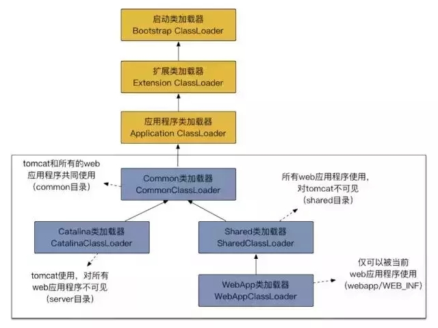 不同应用使用不同的 webapp类加载器,实现应用隔离的效果,webapp类加载器下面是jsp类加载器