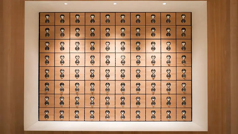 在空间的核心视觉上,我们希望能巩固“沙漏”的品牌印象,设置了一面“会定时自动翻转的沙漏墙”,和天花顶上的由很多沙漏组成的吊灯。