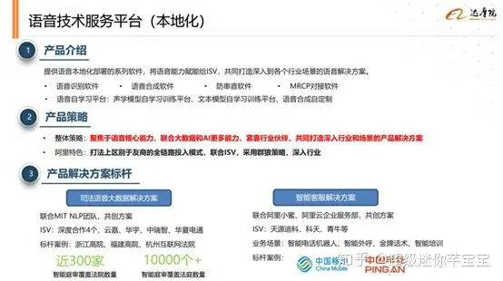 在智能客服领域,我们联合阿里小蜜,和ISV为中国移动、中国平安做了智能电话机器人、外呼以及金牌话术。