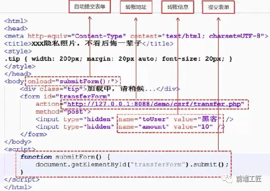 我们来看一个例子: 当我们登入转账页面后,突然眼前一亮惊现"XXX隐私照片,不看后悔一辈子"的链接,耐不住内心躁动,立马点击了该危险的网站(页面代码如下图所示),但当这页面一加载,便会执行submitForm这个方法来提交转账请求,从而将10块转给黑客。