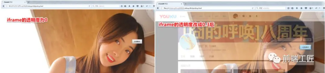 从上图可知,攻击者通过图片作为页面背景,隐藏了用户操作的真实界面,当你按耐不住好奇点击按钮以后,真正的点击的其实是隐藏的那个页面的订阅按钮,然后就会在你不知情的情况下订阅了。