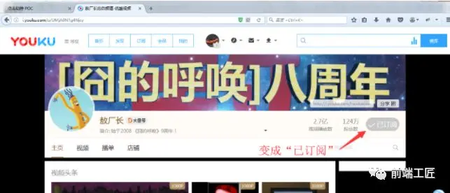 接下来我们举个例子:我在优酷发布了很多视频,想让更多的人关注它,就可以通过点击劫持来实现