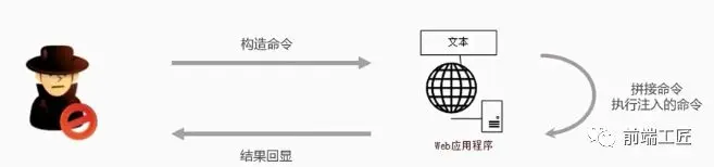 黑客构造命令提交给web应用程序,web应用程序提取黑客构造的命令,拼接到被执行的命令中,因黑客注入的命令打破了原有命令结构,导致web应用执行了额外的命令,最后web应用程序将执行的结果输出到响应页面中。